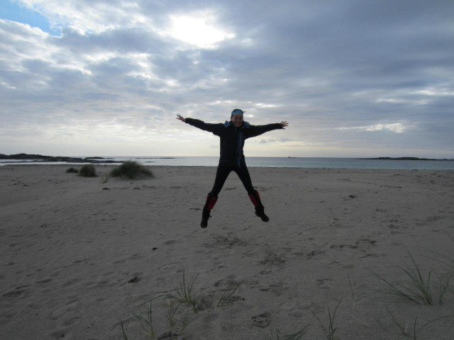 Most of us lost all hope and enthusiasm for climbing, except for Kat who remained determined to climb. She succeeded in persuading Ben and Petra to climb a long slabby Diff, while Sheila and I pottered around at the bottom of the crag, planning world domination. The weather improved and we walked out, passed the ruined croft and then drove to Sanna Bay for a quick look, then away to the bunkhouse.”