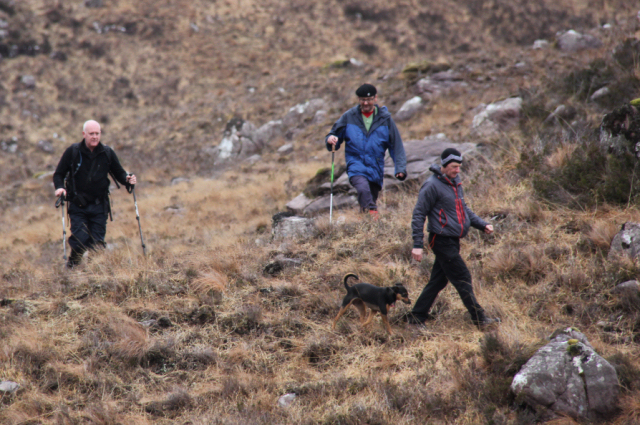 Lunch was had whilst lurking behind a small cliff just below the cairn and then it was time to return. Zippy and Tigger, both fully versed in Roman navigation techniques, quickly plotted a straight line back to the car. It might be straight in plan, but the elevation profile was a little less so. However, once started, there was no going back. A few diversions were needed to avoid the most precipitous of the cliffs, but eventually Zippy and Tigger weaved a suitable heather clad route to the valley floor. The River Torridon was approached with trepidation, but proved easier to cross than had been thought – speed being the key to feet dry. Meanwhile, OMK was somewhere back up the hill suffering from visibility problems…but we didn’t get where we are today without Darwin’s survival of the fittest. With this in mind Zippy and Tigger buggered off.