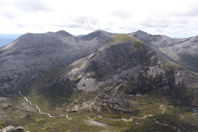 Zippy, Dan, Sheena and Penny TWD decided to ascend Slioch as it was one of only 10 Munros left to bag on Zippy’s round four and Penny’s round two of the aforementioned hills. Forecast was for persistent rain but they were pleasantly surprised to only get a little damp and have pretty good views for much of the day. However gusty winds and cool temperatures near the summit forced a hasty retreat back to sheltered ground where some culinary delights were withdrawn from rucksacks. The menu as recorded by Zippy consisted of “Graeme – malt loaf, Dan – a whole baguette stuffed with sardines fresh from the tin (very smelly), Sheena – a ham and cheese roll followed by half a Soreen, Penny TWD – scraps”. The views were good with the return plod back to the car seeming longer than the way out. A good day on the hill.