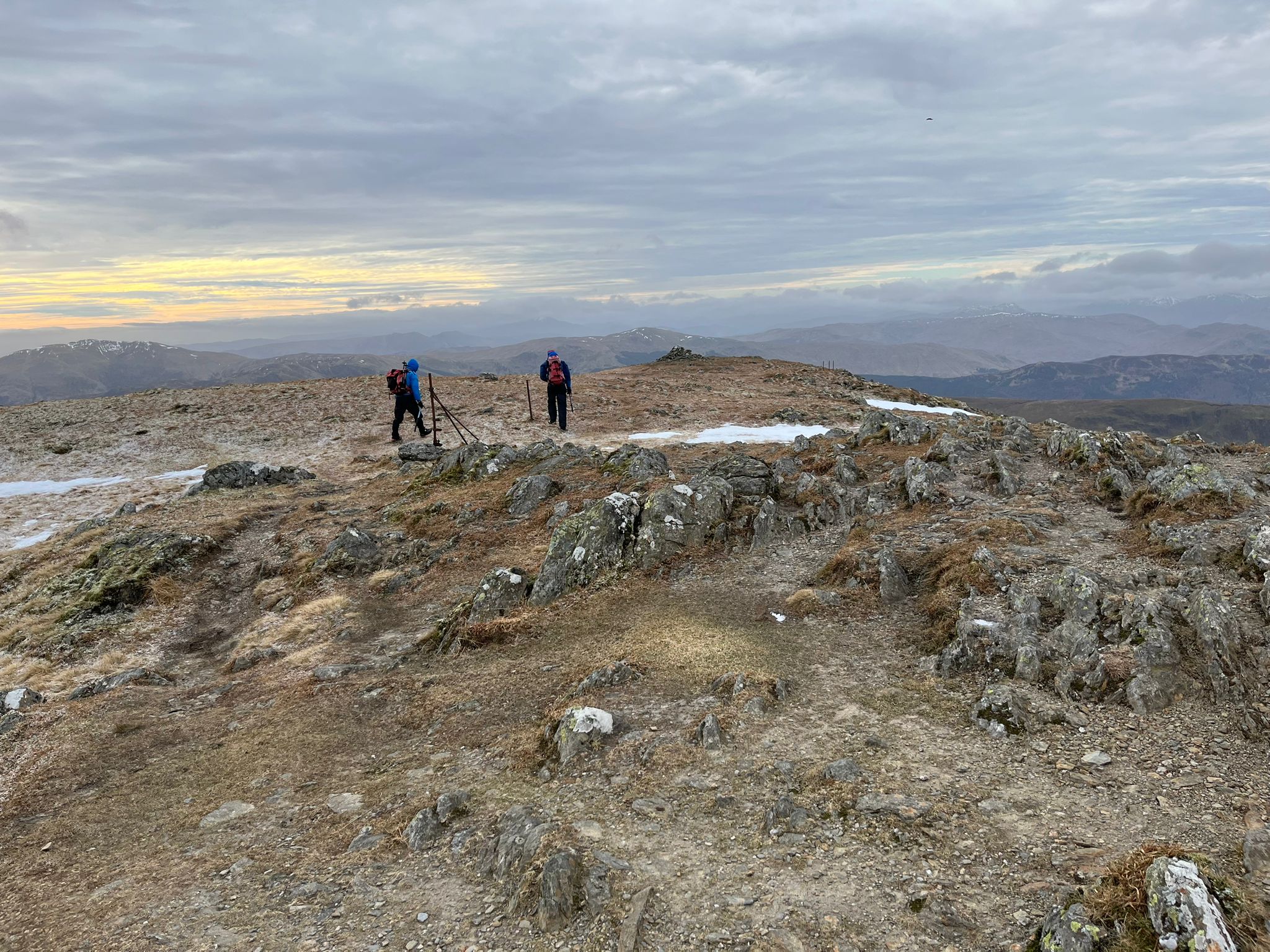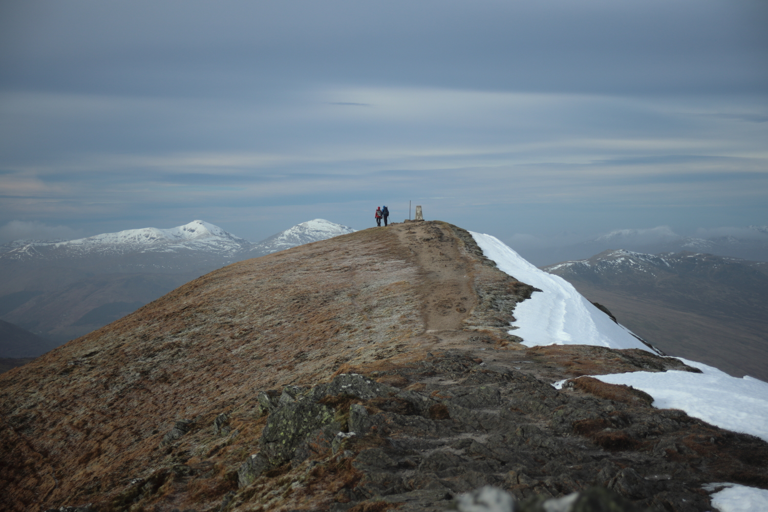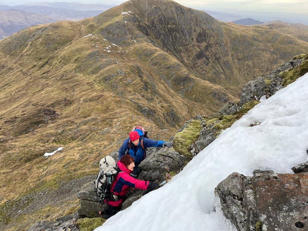 Alan, Fiona, Dan, Steve and Graeme too had a munro day up Ben Vorlich and Stuc a Chroin. There were already about a dozen weegies parked up when they arrived at the Ben Vorlich car park, and one Moray Neep gurning about a brand new head torch he’d left on the table in the hut. Fortunately, some time later, Alan noticed the Neep’s distress and thought it appropriate to mention the shiny new head torch he’d found earlier that day. Now, fully prepared with torches (and batteries), they all headed up the fine path to the summit of Ben Vorlich. Steve and Graeme formed an advance party for the next hill (Stuc a Chroin) – never to be seen again. Fiona, Alan and Dan followed… after first coffee, second breakfast and third faff. The final ascent to Stuc a Chroin is pretty steep, and a few small bullet-hard snow patches towards the top added to the excitement. Dan took the left-hand rock route through the small crag, Alan took the harder looking direct route up the snow/ice and Fiona stood on a ledge waiting for mountain rescue. Happily, everyone finally made it to the summit. Nice views, but a bitter wind meant that it was not a place to hang about.