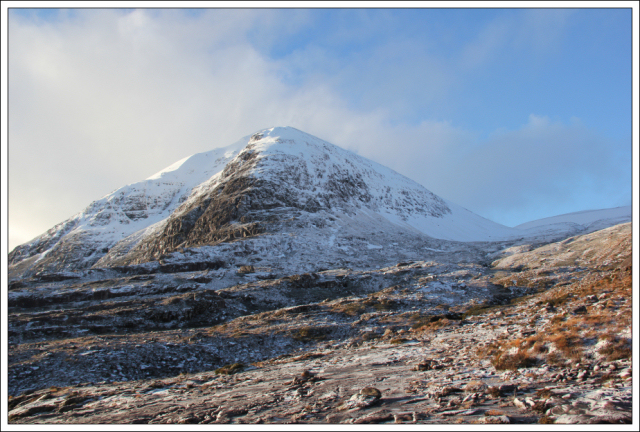 Initial thoughts of progressing to Sgurr Fiona were quashed by the inclement weather. The wind increased as we descended and the spindrift sneaked into any openings.
