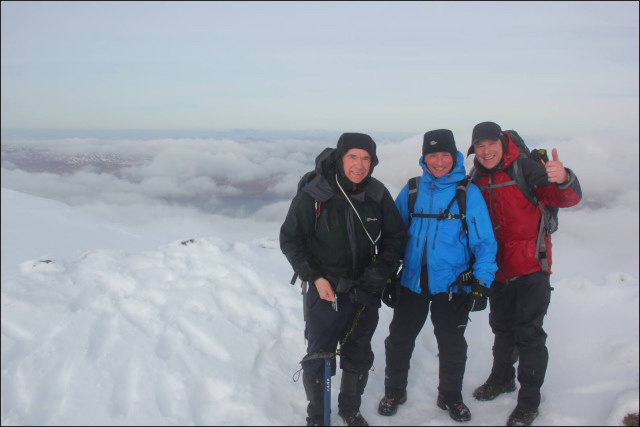 “The plan was hatched over a couple of drinks on the Friday evening ‘Let’s go to Mull and climb Ben More taking a circular route up the A’Chioch ridge, over the top and down by the Tourist Route’. It meant catching the first Corran ferry and getting to Lochaline in time to get the first ferry of the day to Mull! Remarkably they did it and set off on a calm misty morning in good heart and time to spare before the last ferry back. Unfortunately, at about 700m the 25 -30mph wind became a howling gale and discretion got the better part of valour and the team backtracked down about 200m to contour round to the “Tourist Path”.