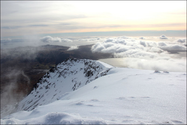 An excellent day with a stunning sunset to enjoy.” Recently completed Munroist Penny The Wonder Dog, unsatisfied at her achievements so far and intent on bagging more lists of hills, dragged poor Graeme up yet another hill. Penny’s faithful friend was seen trotting after her as she strode purposefully up Tom Meadhoin and Beinn Na Gulaig to bag these two hills which will henceforth be known as “Grahams” in honour of Penny’s long-suffering companion, and testament to the spelling skills of dogs. The walk passed some waterfalls, a bit of history in the shape of Wade’s road that once linked An Gearasdan to the south, then some bush-whacking through the forest before the ridge was gained and soft snow made the going difficult. Clear weather made for stunning views of Ben Nevis and the Mamores and a grand day out.