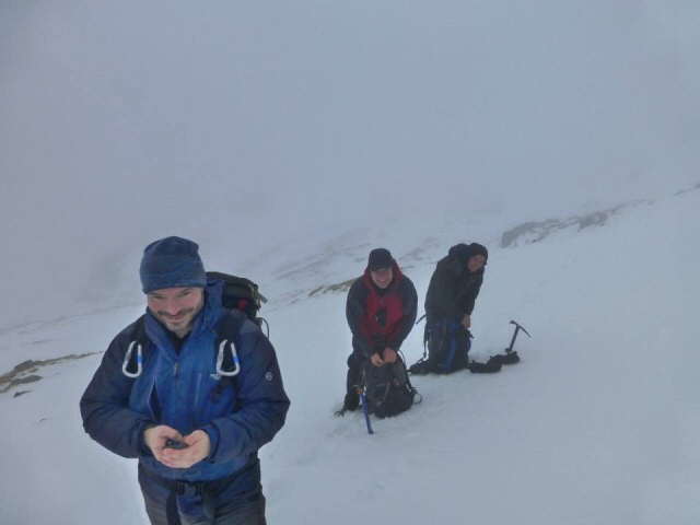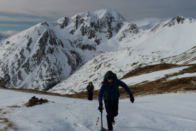 Speaking of the Mamores, this was the destination chosen by Dan, Jenny and David T: “We headed up Na Gruagaichean from Allt Coire Na Ba. Having done a lot of summer hill walking, this was David’s first day in the hills in winter. He had borrowed a dodgy pair of crampons… which worked to an extent, but proved troublesome.”
