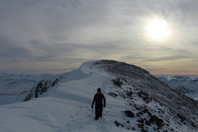 Another group consisting of Alan, Jake, Fiona, Ella and Drummond climbed Beinne na Cille, Fuarr Bheinn and Creach Bheinn with good snow conditions and gradually improving weather as the day progressed. Unsurprisingly, given the constituents of the group (two Beatties, Ella is keen to point out, not three, and one Jake who is more accustomed to spending his mornings in a goonie with a pot of coffee than in the ridiculous pursuit of early summits), darkness fell while they were still high on the ridge. But not to worry, the sunset was worth it! Sunday dawned not quite as bright as Saturday and people went their separate ways. The Saturday Mamore Trio went skiing on Aonach Mor and the Glen Gour Trio took a walk up Glen Roy, where the snowfall and subsequent melt picked out the “parallel roads” beautifully These long flat terraces that occur at distinct intervals on the sides of the glen have a variety of theories as to how they came about. The best one so far is that they were created by the Celtic giant Fingal who drove along the sides of the glen in his chariot while hunting, leaving his trace for evermore. Moray man Sir Thomas Dick Lauder and his acquaintance Charles Darwin weren’t quite so sure about this explanation however, but the latter was quoted as saying “It is far the most remarkable area I ever examined… I can assure you Glen Roy has astonished me.”