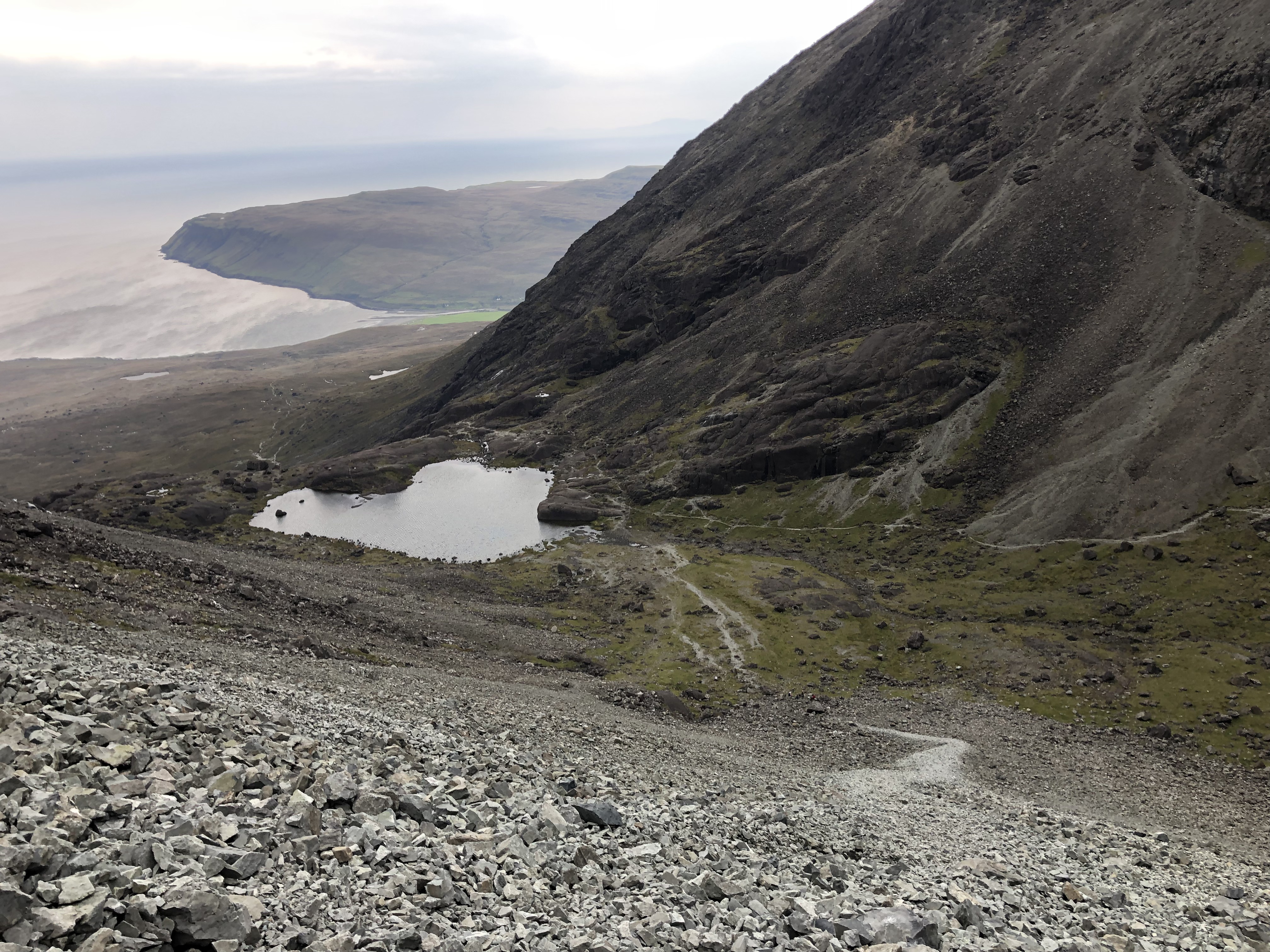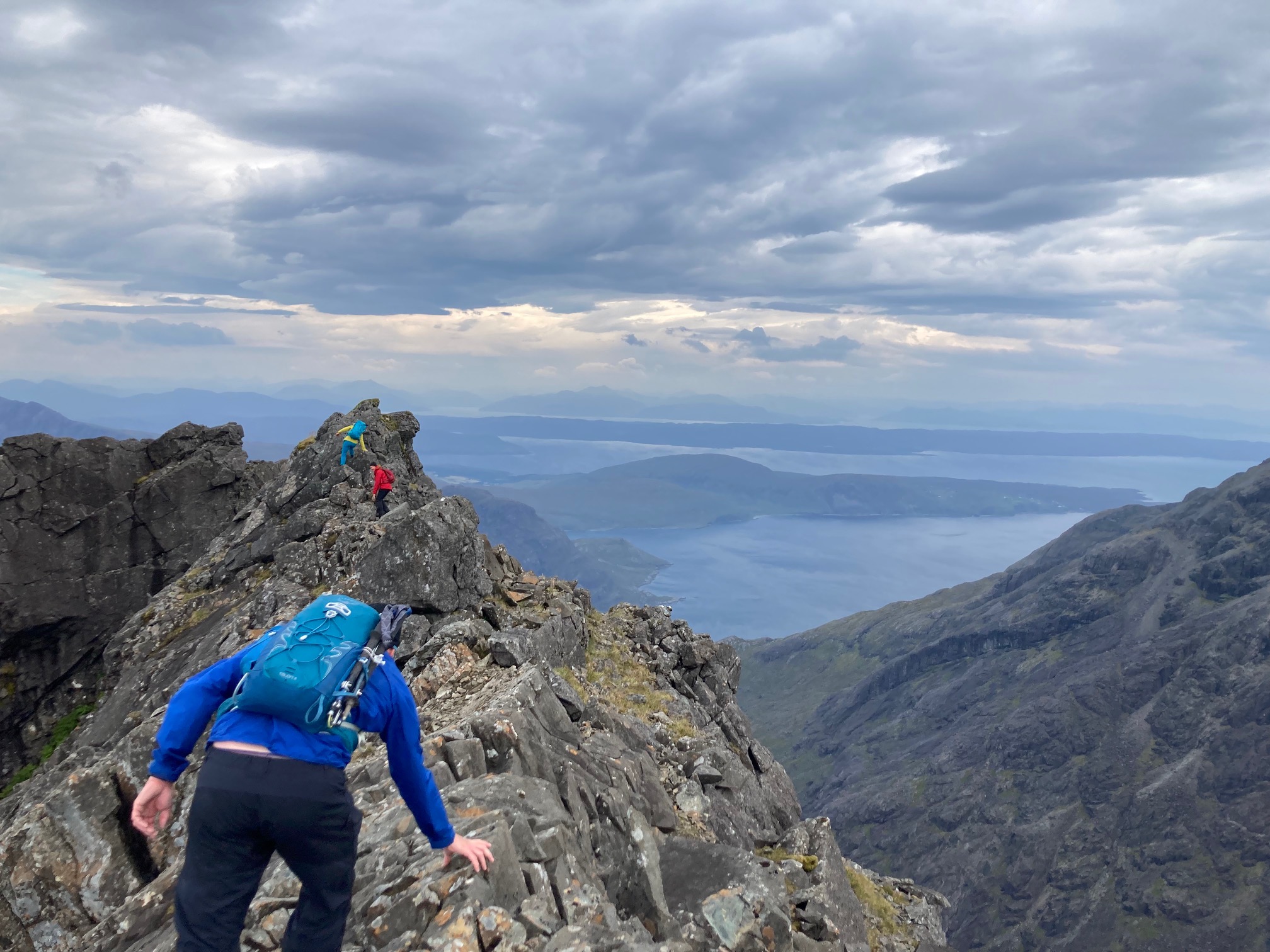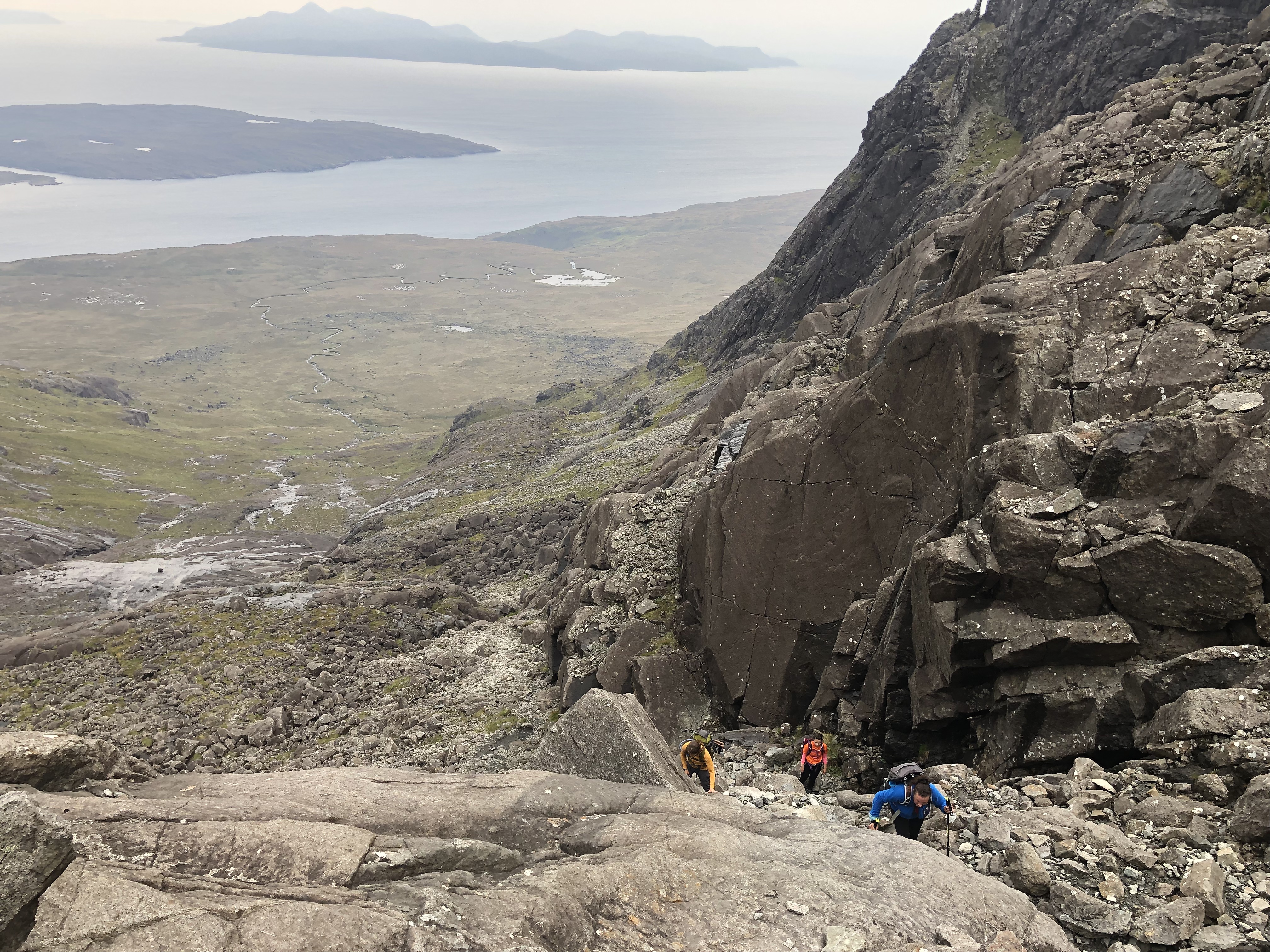 With Dan and Joe G looking to assess some of the more difficult parts of the Cuillin Ridge, namely the T-D Gap and the King’s Chimney, David decided to seek adventure and join them. They split off from the larger group and headed to the base of the T-D Gap. Once on the ridge, the wind was spectacularly gusty, looking at the moderate, but highly exposed climb onto the top of the T-D Gap, before the abseil with the wind, they were not filled with confidence. At this moment, Joe G mentioned that we were next to what is claimed to be the last climbed peak in the UK, Sgùrr Coire an Lochain, reputed to have been first ascended in 1896. They made their way over and reached the highest point on the ridge. Interestingly, the true summit of the ridge, was in fact lower than the highest point. Down a loose Diff climb, with no suitable protection. With sense getting the better of them, they decided looking at the peak was good enough. And there were grand views! Back they went up a very delightful Grade 3 to Bealach Mhic Choinnich, looked at the Kings Chimney then headed down the Great Stone Chute. A grand day out looking at things!
