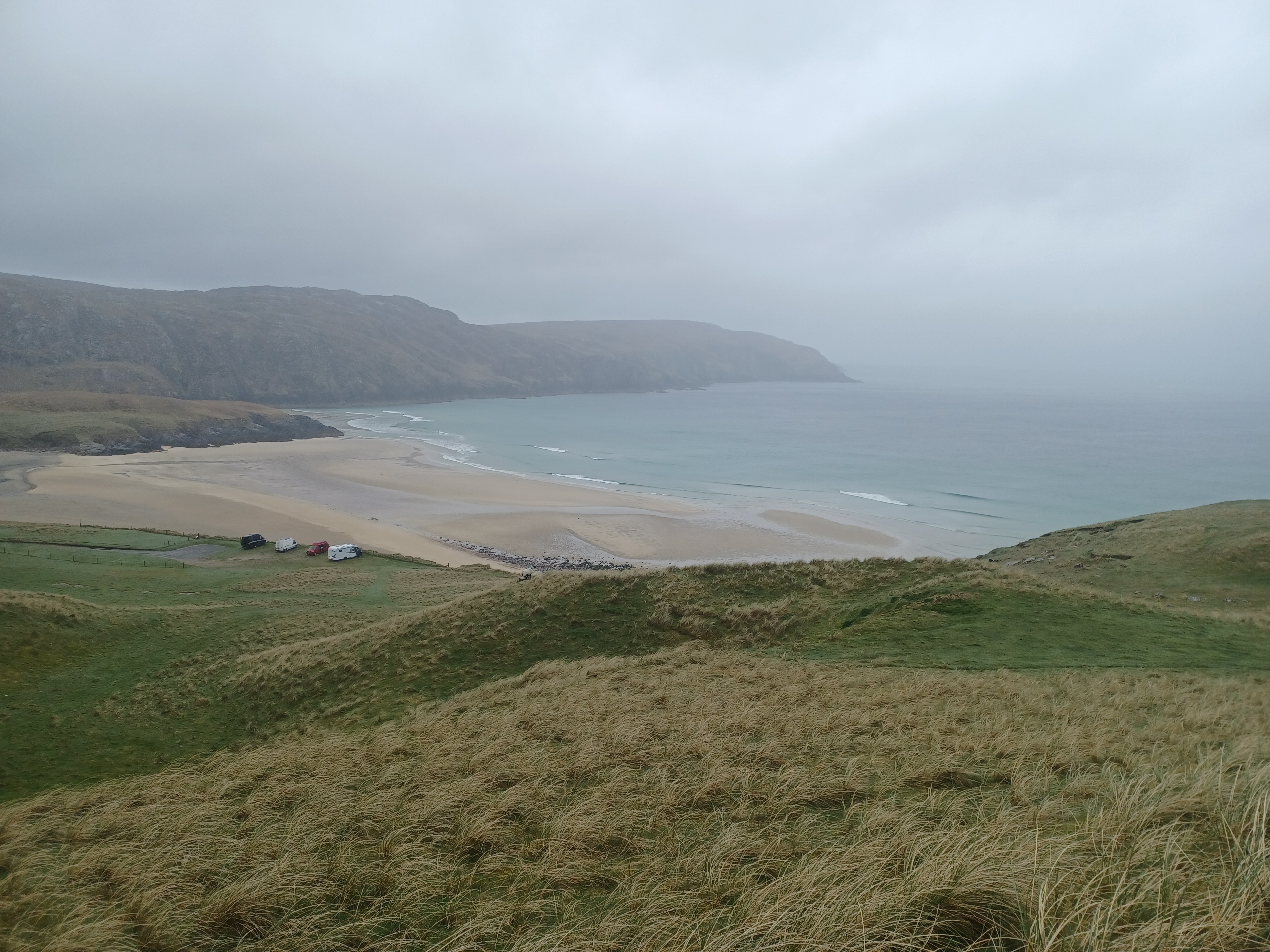 Saturday was the worst day of the meet weather wise with rain and wind until mid afternoon. Debbie, Eveyne and Robert visited the Gearrannan Blackhouse Village, Carloway Broch and the Callanish Stones. Bob and Fiona began walking the cliffs north of Mangersta, but in view of the weather quickly headed down to the beach. From there they headed up to the radio mast at Gob Rubha Phail. Despite the weather they obviously had a good day, as they didn’t arrive back until 7.30pm. Alan, Fiona, Maggie, Katrina and Jake found the coffee and cake shop in Uig. They also visited the local museum and walked to the Uig Sands beach. Alan decided to walk up the ‘Marilyn’ Forsnabhal. I don’t understand why the girls refused to join me as the rain was down to a drizzle. Half way up I turned around and there was Jake chasing after me on his bike. On a good day this hill would have provided amazing views. A drive around the peninsula of Valtos followed on route to the bunkhouse for beers and gin and tonics.