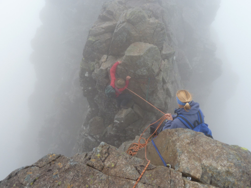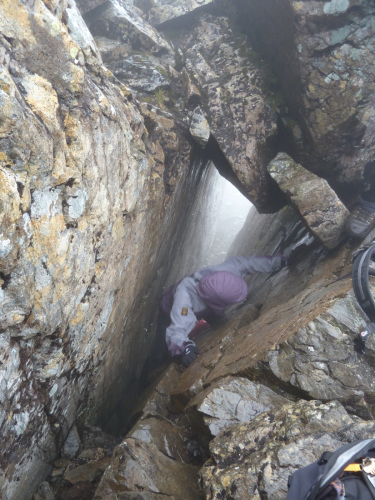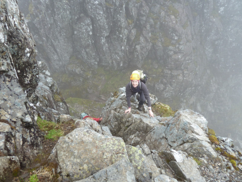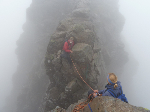 Meanwhile, back at the C.I.C hut, Dave, Jenny, Andy and Illona were starting their climb up Tower Ridge, scrambling up into the loose and slimy East Gully and into the Gap. There followed the smooth 20-metre chimney pitch to gain the ridge properly and on to the Little Tower. The top of the tower was reached via an awkward slanting ledge, followed by an exposed corner, to reach a long flattish section beneath the Great Tower. Scrambling up the nose of The Great Tower, the crew reached the Eastern Traverse and followed round to the deep cleft crowned with a huge boulder. They clambered up through the roof of the cave to reach the top of Great Tower and Tower Gap. Time to rope up for the very narrow ridge leading to the gap where you need to swing down, land on a small block in a very airy position and then lean over the gap to climb out the opposite side. A wonderful exposed position and a fitting end to the climb, with just a short scramble to the top round Gardyloo Gully and on to the summit itself. There followed a rather tame but long troll back down the Tourist Track to the Youth Hostel.