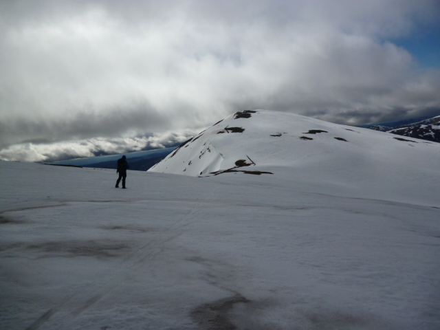 From the top of the ski tow to the summit of Cairnwell the group of nine were blasted by strong gusts. The walk to the col was mostly devoid of snow but beyond the col it was back onto snow, with RayH breaking trail up the initial section.