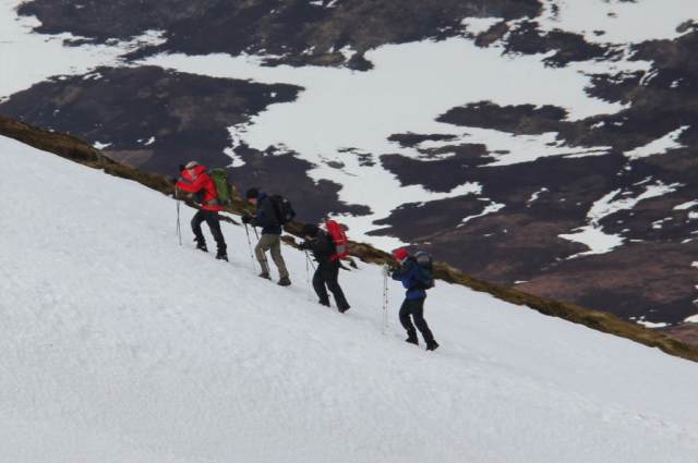 From the Spittal of Glenshee, Bob, Fiona, David, Chris and Fiona set out to ascend the three Cairnwell Munros – Carn Aosda, Carn a’Gheoidh and the Cairnwell. Deep snow was encountered with one of the group becoming temporarily stuck in a pocket of deep snow with a burn flowing underneath.