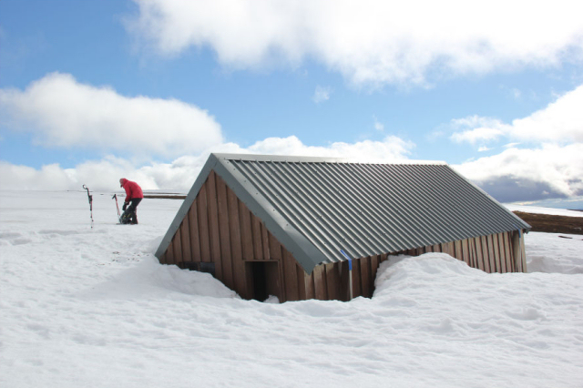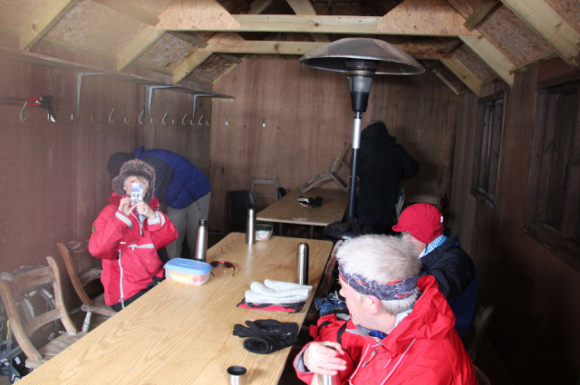 From the summit of the second Munro, the group dropped down to pick up the good track leading out to Carn Mor. During the ascent of Carn Mor, several members visited the Invercauld Estate Walker’s Bothy. The bothy provided some much needed respite from the persistent wind and was a great spot for lunch.