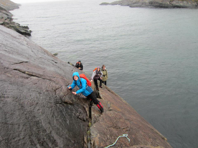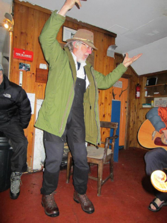 The whole group congregated back in the hut by mid afternoon to put the kettle on and hang up wet clothes. Cups of tea were passed round and some folk opted for something a little stronger. Other more self disciplined types stuck to the old German tradition of “kein Bier vor vier” so by four o’clock the “tshhh” sound of cans being opened resonated around the hut, accompanied by the dull booming of the wind on the cliffs behind. A fine evening was had with entertainment being provided by fiddle, whistle, guitar and songs and recitations including the Glaswegian version of Hamlet as penned by Adam MacNaughton and the wonderful tale of “The Gowk” and his search for Peregrines’ eggs on an Ayrshire cliff. Other notable cultural interludes included delightful limericks such as “There was a young man from Bombay…” while one club member spent a good part of the evening convinced that he could support his weight on two empty beer cans… if only he could spread the weight evenly enough. Several crushed cans and potentially dangerous falls later there was still no proof that this couldn’t be done, just the he “must try harder”.