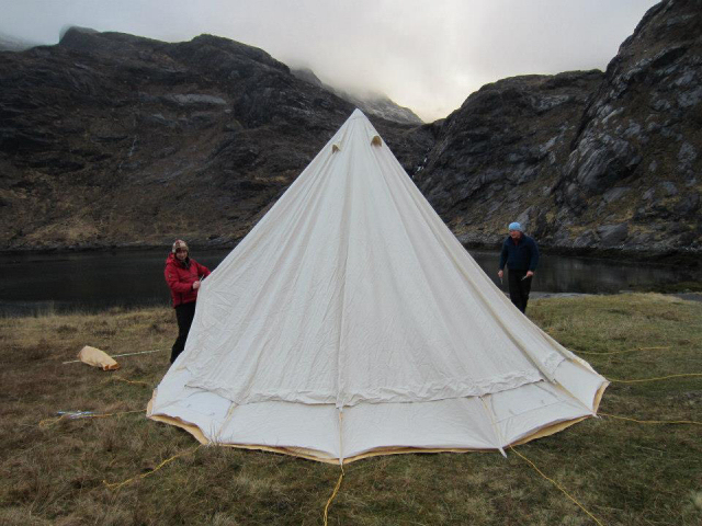 Three tents were pitched while the weather remained fairly settled. There was the club tent, which is a rather fine white canvas tepee, or tipi, but having previously been chastised for my incorrect spelling of the word I’ll resort to the correct name which is “Soul Pad”. Pitching the “Soul Pad” involved several people under the close inspection of a certain “Kim Jong Lee” whose barked orders of “Do not secure the guy ropes at this time” were heard echoing from the bare Gabbro walls surrounding Loch Scavaig. Job done and Kim Jong Lee’s minions were able to admire his massive erection.