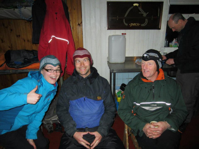 But, seeing as this is a Mountaineering Club and not an Amateur Plumbing Society some tales of mountaineering exploits must be told for the Saturday. Kat, Jenny and Andy walked, or were blown to, the foot of the Dubh Slabs, and fought their way back to the hut against the driving wind and rain. Upon returning they were informed that the “Soul Pad” had completely blown away along with the contents, and for a short period of time one of the group believed this version of events, much to the hilarity of some of the crueller members of the party.
