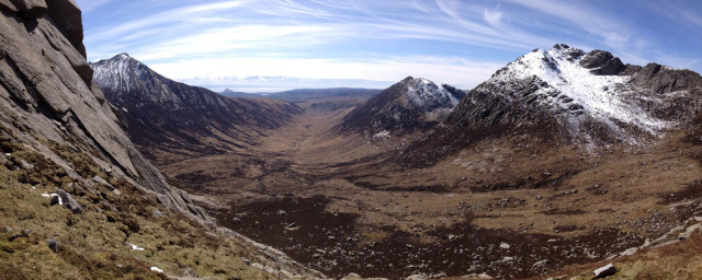 Nicholas and Ray walked out the door of the hall and straight up Goat Fell, the highest hill on Arran. From there they traversed North Goat Fell, Mullach Buidhe and Cioch na h-Oighe before descending to Sannox and a little shelter from the wind. Others went for low level walks, and the standing stones of Machrie Moor were a popular poor weather alternative to the hills.