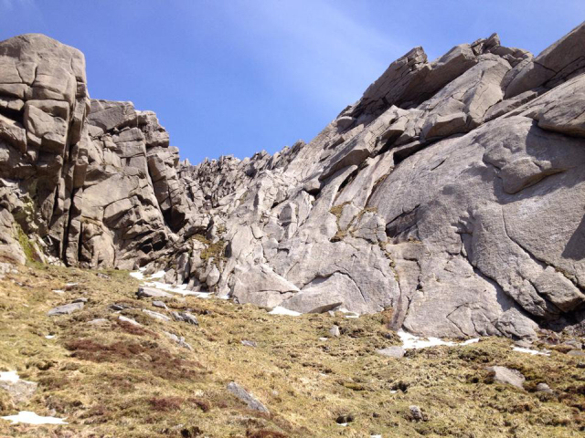 They climbed as two pairs up what has been described as the best “V Diff” in the country, Sou’wester Slabs. After some discussion as to where the route started, a trench was cut through the snow to try to get on the route without soaking the rock shoes. Patches of snow still lay on some ledges on the climb but the sun had heat in it and warmed rock, hands and bodies as the climbers ascended the rock, pitch by pitch. Before long they had traversed onto the South Ridge and were at the foot of the infamous Three Tier Chimney. But would it go? After some struggling, thrutching, swearing, flailing and smears of blood from knuckles skinned on the coarse Arran granite all four made it to the top of the climb, and the summit of Cir Mhor. All that remained was to descend to The Saddle and wander down to Corrie Village Hall. Unfortunately it was late in the day, The Saddle is a point so low on the ridge that the occasional winter storm probably hurls its salty spray right over the top of it, and the highest summit in all of Arran is plonked right in between The Saddle and Corrie Village Hall. After a long steep descent, a longer steeper ascent and then an even longer descent to the sea the hall was reached and the climbers were able to relax and tell tales of derring do upon the rock face.