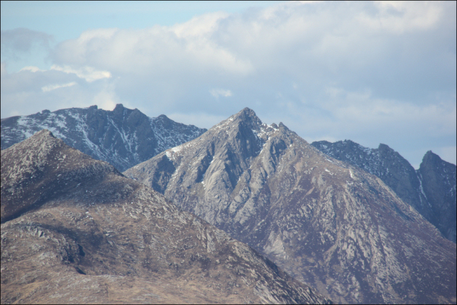 Saturday and Sunday weren’t the best weather-wise but luckily Friday and Monday were lovely. Two people who managed to get to Arran early were John and Andy. Keen to bag their requisite number of Marilyns before their trip to St Kilda where they planned a joint ascent of their 1000th, they headed to the Holy Isle. The weather was glorious for drinking in the unique atmosphere of the island. The Soay sheep and Eriskay ponies wandered the grassy hillsides, Buddhist rock paintings dotted along the western shore of the island and the hills of Arran were beautiful to the north with large snow patches glistening under the sun.