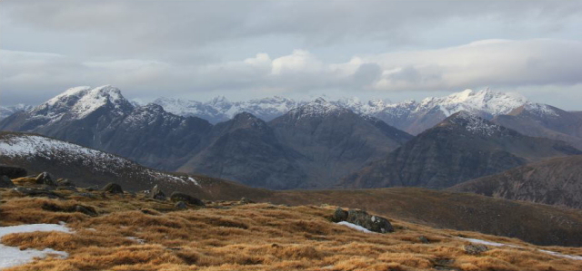 The first day of the year arrived shortly after the party-goers had gone to bed and was a pleasant day for the hills. AndyL, Graeme, Shona and Penny TWD crossed the sea to Skye to walk over the Beinn na Caillach, Beinn Dearg Mhor and Beinn Dearg Bheag horseshoe above Broadford. Fantastic views of the Cuillin were had after a trackless steep ascent.