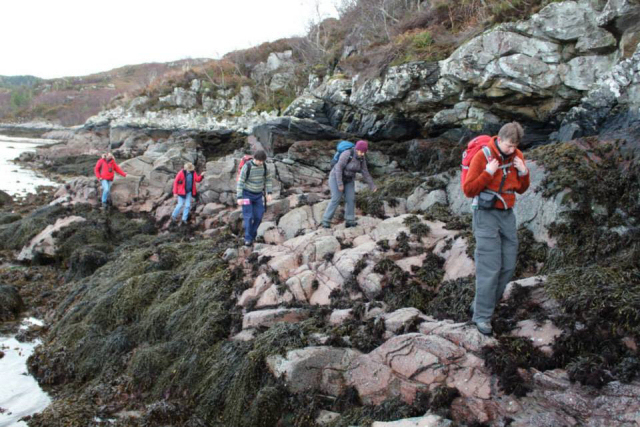 The assembled hungover hordes back at the bunkhouse eventually dragged themselves from their beds, and after some rehydration, caffeine intake and perhaps even some breakfast staggered into the light of day for a wee coastal walk. The views of the snow-capped Cuillin beyond the sparkling sea were gorgeous and almost enough to make one wish that more sleep and less drink had been taken the previous evening. Almost, but not quite. The hazy memories of the surreal village dance were enough to raise a chuckle and rattle a sore head. And anyway, a good view is a good view. It would be churlish to reject a beautiful coastal walk for the pleasures it gives, even if the challenges of greater things appeal, and those greater things are in sight.