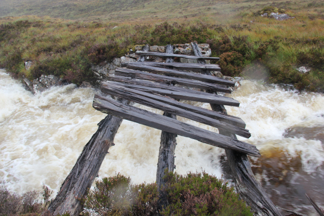 First to disembark the coach were Andy and John. From Poulary, Andy and John set out with the intention of ascending Sgurr Choinnich, a Graham more usually ascended from Loch Arkaig. Andy and John managed to progress approximately five kilometres towards Sgurr Choinnich before being stopped in their tracks by an impassable burn with a somewhat dilapidated bridge. The consensus reached was that it would be better to live another day than to risk crossing the bridge so Andy and John returned to Poulary before walking a further 10km along the road in the direction of the coach.